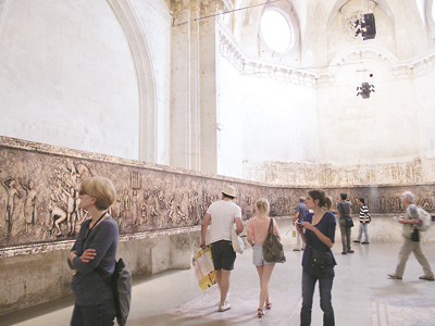 但是可不要小看这座方寸之城。阿尔勒始建于公元46年,被誉为“高卢人的小罗马”,保留了古老的罗马城墙、圆形竞技场,有7座古迹被联合国教科文组织列为世界文化遗产,城中还点缀着众多17世纪、18世纪的典型建筑。自然美景和人文历史背景为摄影师们展现个性提供了丰富的选择。在持续3个月的摄影节期间,60余场展览就“埋伏”在这一座座巴洛克风格的教堂、古罗马时代的废墟、小咖啡馆、艺术书店,甚至民居的酒窖中。当我们参观一位中国摄影师朋友的展览时,穿过曲曲折折的小巷里喝酒谈天的人群,却直接被领进了餐厅。原来展览就利用了餐馆室内的布置,侍者们则殷勤地为参观者添着葡萄酒。