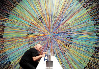 10月10日,在德国法兰克福举行的法兰克福书展上,奥地利摄影家、出版商鲁·拉梅胡博展示一直线粒子加速器(linear particle accelerator)模型。背景显现的为粒子碰撞时的情形。法兰克福书展从10月12日持续到16日,来自110多个国家和地区的近7500家展商参展。今年书展的主宾国为冰岛。