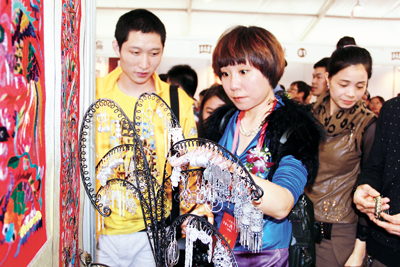 10月12日,杭州西湖博览会上,民间艺人的精美手工艺作品吸引了众多观众。