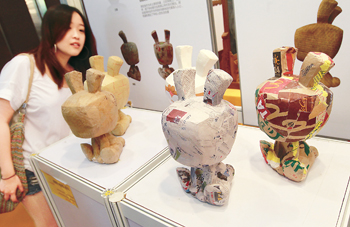 观众在近日举行的2011上海设计展上参观用废纸制成的卡通储钱罐。 新华社记者 裴 鑫 摄