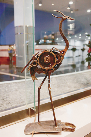 北京汽车博物馆中,用废旧汽车零件和工具做成的雕塑生动有趣。 本报记者 康 伟 摄
