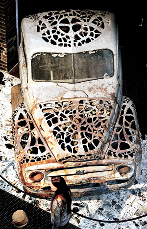 澳大利亚名为“爱蕾丝”的当代蕾丝艺术展上,艺术家英格丽德·莫利借助等离子切割机在一辆废旧农用卡车手工切割出蕾丝花纹。 新华社/法新 |