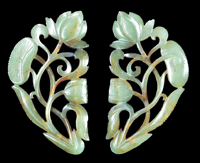 器双面镂空雕刻一枝莲,由叶、果实和花组成。折枝花是宋金时期玉雕工艺的创新题材,花枝交错、翻转掩映,形成多层次和立体的效果。从器型看,此可能是簪首,底部嵌于金银材质的簪体。 |