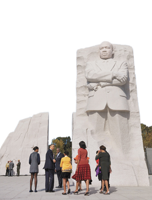 1. 美国当地时间10月16日,出席马丁·路德·金纪念园揭幕仪式的美国总统奥巴马和家人在马丁·路德·金雕像前。 新华社/法新