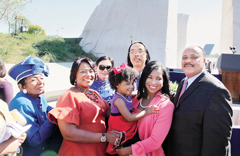 3. 雕像作者、中国雕塑家雷宜锌(后排右)在揭幕仪式上与马丁·路德·金的妹妹、儿子、女儿合影。