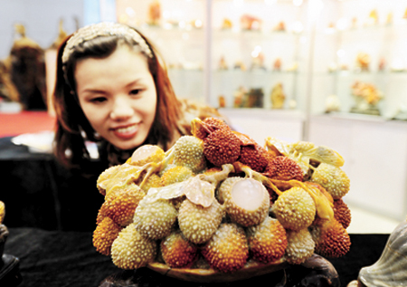 10月20日,烟台国际博览中心,参展商在展示福建寿山石展品。