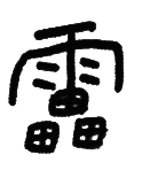 雷电同时发生。光速快,声速慢,所以先见闪电,后闻雷声。甲骨文雷象折枝闪电形,这比常见的根系闪电要强烈一些。两旁菱形象球状闪电形,俗呼地滚雷,强烈更甚。金文加添雨头,折枝闪电照旧,地滚雷则添成四个田字。这当然非田字,雷和农田没有关连。想来该是四个车轮之形,因为圆形不便锓刻,所以方了。“车走雷声”李商隐句,比车声如雷之轰隆,乃有雷车一词。旧时雷神塑像,面黑嘴尖,执锤敲凿,蚩氓以为轰隆之声是在开山。更有趣者闪电娘娘红衣红裙,两手各举圆镜,镜与镜之间有一绳相连,所以叫“扯火闪”,真是她在举两手横扯呢。到了篆文简成三轮。最后简成独轮,是为隶变。