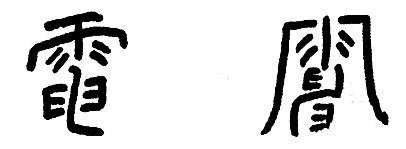 顺便说说雨字。两个甲骨文,一象檐溜形,一象瓦沟流水形。电字繁体作電。古文电雨头下双手拉伸一绳,这是申字,作声符用。后人不明白,以为闪电是两手拉扯出来的,所以雷神塑像如此。还有,这个申字作为符号表示电力,今常见之。 |