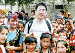 2007年10月,赴新疆采访时和少数民族儿童在一起