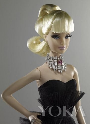 艺术家斯特法诺-坎杜里设计制造的这件孤品芭比娃娃身着黑色露背晚装,身材与其他的芭比一样令人窒息,所不同的是,她的脖子上带了一串装饰着一颗重达1克拉的方形粉钻项链。