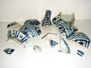 按照《景德镇陶录》记载,“其方棱者,用布包泥,以平板拍连成片,裁方粘合。”而这件瓷器也让蒋先生印证了元青花、方器的制作工艺。数月前,藏家把一堆青花碎瓷片捧到蒋先生面前,从15块碎片内侧,可以看到多处非常清晰的接胎痕迹。蒋道银先生介绍说“古陶瓷修复分为清洗、黏结、补缺、打底、彩绘、罩光等步骤”。蒋先生首先把碎瓷片放入超声波容器内清洗,并为每一块瓷片标上编号,随后开始由下至上黏接。黏接完成后,用专用填充料填入器身残缺部位。待补缺部位打磨平整后,就能配色喷釉。元青花的底色是白中带绿的“蛋壳青”,他采用器械喷绘法,严格控制喷绘范围。
