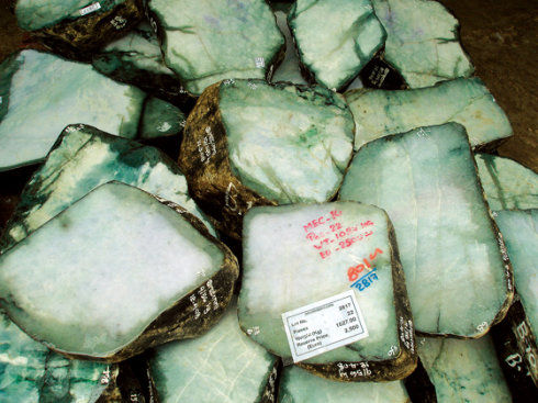 首先,原料中有行活。因为翡翠原料出产的一般是比较大块的。小的可能也要几公斤一块,大的就是几吨一块。翡翠的出产本身就是比较大块的原料。在这些原料当中只有其中的有鲜艳的绿色,质地、种份比较通透的,或有鲜艳的绿色或紫色、黄色的才有价值。往往在一大块原料当中,一点鲜艳的绿色都没有,即使这一大块原料几吨重,但都是白白的、质地也不通透的,虽能出产几万件但也是普通的翡翠。如果在一块大的原料当中,能有一条绿色的带子,那这一块原料马上就身价百倍,哪怕在这块原料当中,这条绿色的带子,在里边出产的翡翠只占到整个这块原料能够生产的翡翠件数的千分之一到万分之一,顺着这个带子做出的东西是高档货,其他就是普通货。这说明在翡翠当中,行货出产的量尤为巨大。此外,在翡翠当中,如果是颜色特别偏暗、不够鲜艳,质地不够通透,原料里面绺裂、毛病过多,因此做出来的成品上面的工艺特别繁杂,具有这几点的都是行活。