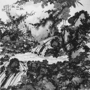 本作品描绘的是雁荡山灵岩寺后的一个小瀑布的景色。虽然只取了小龙湫景观的一角,但却从平凡的题材中升华出了不平凡的艺术境界。画面中的龙湫水是视觉中心,配以山岩与花草结合,既不同于前人的鸟瞰式山水,又不同于仅配以假山的单纯花卉。而在表现上,为使山水与花卉和谐地统一在一个实景之中,作者以变化丰富的笔线构成画面的骨架,不仅具有构图的骨力与气势之美,也颇有西画中的构成意味。