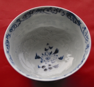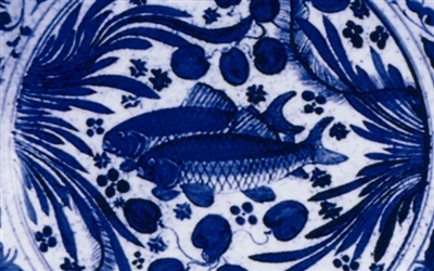 图2、3是日本松冈美术馆藏元青花鱼藻转枝莲纹圆口大盘局部特写图的撒蓝效果,系在生坯上绘制图案后用笔沾青料随意甩撒形成的,达到了潇洒自然、妙趣天成的艺术效果。
