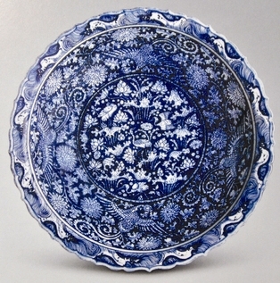 图1土耳其托普卡比宫藏元青花青地白花莲池水禽纹菱口大盘