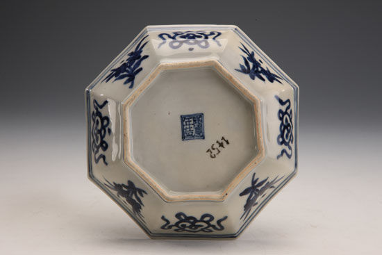 隆庆一朝时间较短,景德镇窑瓷器遗留传世的器物并不多,以小件器为主,少见大器,胎、釉较细腻。青料用回青,呈色稳定、纯正,蓝中泛紫,但不像嘉靖器般紫得厉害。纹饰与嘉靖朝相近,佛道内容较多。多六角、八角等造型。带年款的器物甚少,官窑器的款识有“大明隆庆年造”和“隆庆年造”两种,不见“制”字款;民窑器款有“隆庆年造”或“制”四字款;吉语和赞颂语款有“万福攸同”、“福寿康宁”、“富贵佳器”等。因此,这件带年款的八角盘虽为民窑器,但也弥足珍贵。