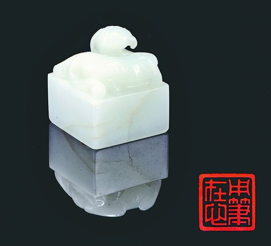 印章选材上等白玉裁切而成,玉质极佳,如割脂截蜡。顶琢一半伏卧之螭龙,寓动于静,神情活灵活现,煞是可爱。印面以阳雕法作四字篆书“用笔在心”印文,行刀老练,印文法度严谨,气韵古朴。所刻印文为唐代书法大家柳公权答穆宗所问,论用笔之法,全文为“用笔在心,心正则笔正”,此语可谓别有深意,不单论书法之道,亦是为人处世之真理。