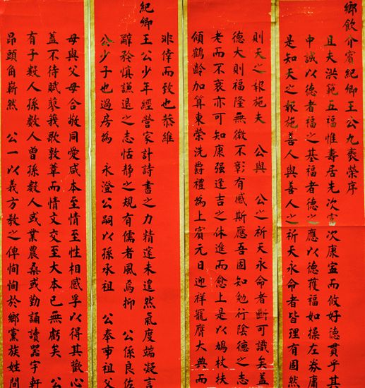 《乡饮介宾纪卿王公九秩荣序》寿屏共12幅,单幅宽39厘米,长180厘米,红宣纸本。正文楷书,文后为“举贺”翟奎文等10人、“阖学”王建封等10人、“亲友”张克让等90人、“乡眷”翟六合等40人、“族人”王五桂等40人姓名,尾署“龙飞光绪十三年二月初四日谷旦”。由“阖学”署名“王建封、于浚川、初星海”等均为昌邑人推测,该序主人王纪卿应为昌邑人。由序文中“余与公谊系邻村”可知,该序的撰文者张汇堂也是昌邑人。该序的书写者为郭育才,字木初,号升生,潍县人,出身书香世家,光绪甲午恩科二甲第四十名进士,朝考二等,入选翰林院庶吉士,散馆改兵部主事,受派办理安徽六安州霍山县教案,事后,安徽巡抚奏荐任池太同知,调任邮传部郎中,襄办全国船政,生性恬静严谨,为官清正廉洁,为人称道,工书法,精魏碑,晚年益苍秀婀娜,曾寓居上海,擅名一时,卒年七十五。该幅作品是存世不多的郭育才早年工楷书作,通篇以赵体为主,一丝不苟,由此可以窥见其楷书功底和早年书风。
