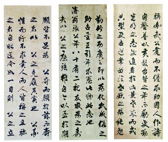 《恭祝皇清太学生濬公张年兄八秩荣寿序》寿屏原装裱于12面屏风上,另一面为12幅山水画。寿屏单幅宽57厘米,长157厘米,白宣纸本,正文行草书,文后为“亲友”姜镤等50人、“族人”张九思等27人姓名。由寿序内容可知,该序主人张濬为昌邑人。寿屏的撰书人翟德先亦为昌邑人,光绪三十三年本《昌邑县续志》卷五《人物·文学》有传。传曰:“翟德先,字祗台,石埠人。中嘉庆辛酉顺天第三名举人,连捷进士。学问渊博,文宗名家。著有《蝶阶百咏》。初宰高阳,自以绌于吏治,改泰安教授,与诸生讲论不倦,成就者多。卒于任。平生著述多留任所,无由采取,仅存《百咏诗序》。”光绪年间纂修《昌邑县续志》时,翟德先的文章即无由采集,当时看到的《百咏诗序》也已散失,故这篇《恭祝皇清太学生濬公张年兄八秩荣寿序》可以说是现知翟氏唯一的存世文章。另外,其书法通篇雄壮恣肆,笔墨俱妙,亦是不可多得的艺术精品。