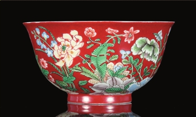 清宫造办处的档案记载,珐琅彩的制作过程是:甄选品质最佳的景德镇烧造的白釉器作为瓷胎,由内府造办处珐琅作的宫廷画师,遵照御旨,用进口的珐琅料在瓷胎上绘制纹饰,然后经第二次窑火烧制始成。所以这种造办处的作品数量极少,工艺精湛绝伦,只供御前陈列赏玩,传世数量很少,是中外收藏家们珍视的名贵品种之一。冯先铭先生在其《中国古陶瓷图典》一书中就称赞:“官窑器中‘康熙御制’款的珊瑚红地五彩器最为珍贵。”相似的五彩九秋碗在海内外各大公私收藏中均有著录。