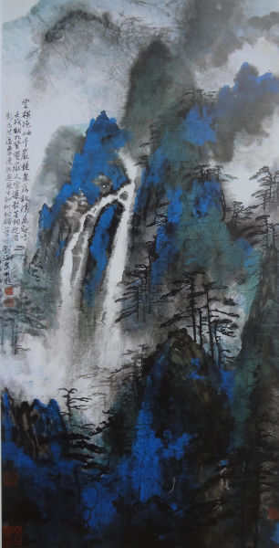 刘海粟的山水画,前后风格变化非常大。前期主要受石涛和沈周的影响,笔线像沈周,构图、用墨则更接近石涛。那时期,他似乎并不特别在意色彩的探索而更注重水墨的运用,早年作品中,设色作品并不多见,仅有的几件,也以用色清淡的浅绛山水为主。大部分作品都类似写生稿,用细密的线条勾勒,用淡淡的墨色渲染,单纯而明快。从1950年代末开始,刘海粟开始了没骨青绿山水的探索,缤纷的色彩开始出现在他的作品中。而他这时期的水墨山水,显然也受到没骨画法的影响,水墨层层渲染,因此画面厚实、层次丰富。刘海粟把没骨青绿与水墨勾染的技法融汇贯通,开创了泼彩山水的新面目。
