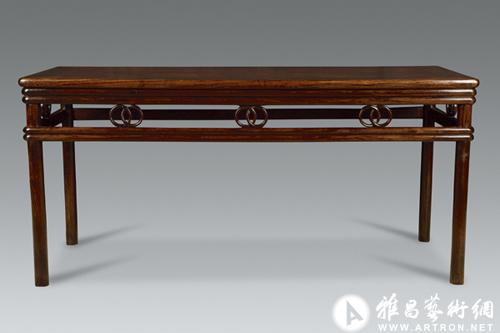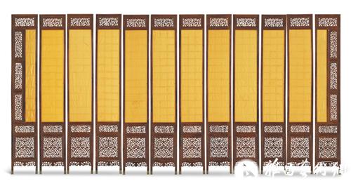本次秋拍一件“明黄花梨镂雕螭龙纹十二扇屏”受到藏家广泛关注,此物系2011年7月9日北京首都博物馆“物得其宜—黄花梨文化展”展品之一,著录于2011年7月《收藏家》首都博物馆?物得其宜黄花梨文化展专辑p6-7。此十二扇围屏体积硕大,构思缜密。通体为黄花梨制作。每扇分三部分,上下为透雕福寿纹及螭龙纹绦环板,中部为纱面屏心,下为亮脚,直腿穿铜靴。整器雕饰精美,富贵典雅,线条流畅,保存完好,反映了古典家具的独特气魄与艺术风格。“明黄花梨龙纹镂空长花板(一对)”也是北京首都博物馆举办“物得其宜—黄花黎文化展”展品之一。该对花板选黄花梨为材,形呈长方,花板中央镂空雕“龙戏”图。龙是中华民族进入农业社会后创造的一种虚拟动物,是中华民族精神的图腾,《说文》中有载:“龙,鳞虫之长,春分而登天,秋分而潜渊。”