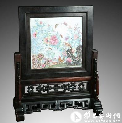 清乾隆紫檀宫廷嵌瓷胎画珐琅花鸟纹插屏