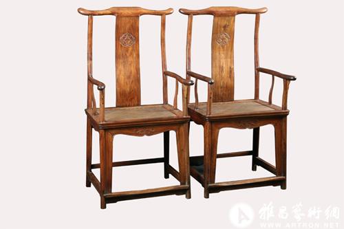 海外回流艺术品一般是当朝输出或战争散落,其工艺、材质皆为上上之选。本场拍卖一件“明黄花梨雕卷草纹四出头官帽椅(一对)”非常珍罕,此物原为美国西雅图藏家所有。四出头官帽椅是一种搭脑和扶手都探出头的椅子,其造型像古代官员的帽子而得名,是家具档次的象征。此对四出头官帽椅由黄花梨制成,椅的搭脑和扶手均出头,搭脑过立柱后仍向前探,并在尽端向外挑出、翘起,搭脑中段弧度呈罗锅式,扶手两端外撇,与搭脑和谐统一,曲线优美,富有弹性,造型十分夸张。靠背板绚丽呈“S”形,中央雕卷草围绕莲花支托状图案,圆形立柱与后腿一木连做,两扶手正中下接联帮棍,以下粗上细直立,即“老鼠尾巴”的做法,鹅脖部分向前倾斜,与适合人体靠背的曲线相对唱和古人讲究坐相,通过椅子靠背板与扶手曲线的造型语言来传达坐者的威仪与端庄。上下无一丝装饰,结构简练之极,完全采用线条和弧度来处理,线条曲直相同,方中带圆,充分体现了明式家具简洁明快的特点,是明式椅具中的精品。