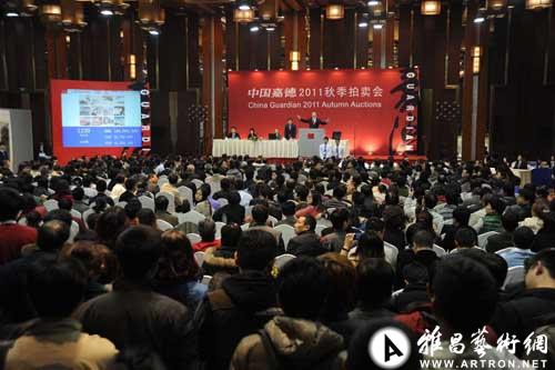 11月13日晚8点,中国嘉德“大观——中国书画”夜场在北京国际饭店会议中心举行,此专场是继春拍之后第二次推出,2011春拍大观夜场共斩获逾十亿元人民币,齐白石巨制《松柏高立图·篆书四言联》以4.255亿成交,刷新世界纪录。