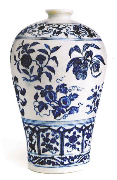 明永乐“青花如意垂肩折枝花果纹梅瓶”,高36.5厘米,纹样细腻柔美,形制比例得当,是一件难得的永乐瓷器杰作。2011年10月5日,在香港苏富比秋拍中以1.383亿元人民币成交,刷新了明代中国瓷器拍卖世界纪录。