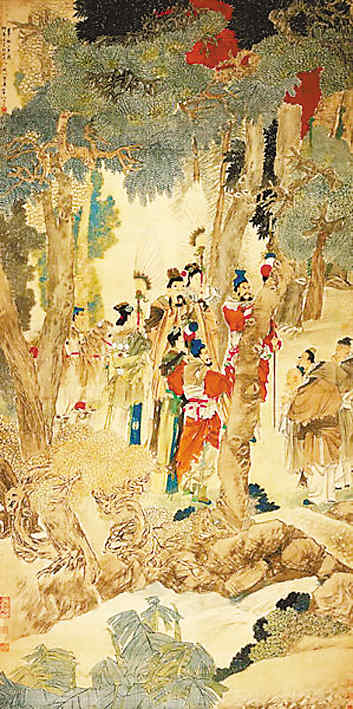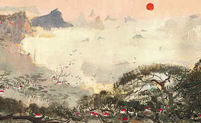 《毛主席诗意册》(局部)是傅抱石的代表作之一,作于1964—1965年间。作品有大胆而富于变化的构图、瑰丽而沉毅的色彩,充满浪漫主义的诗情画意。