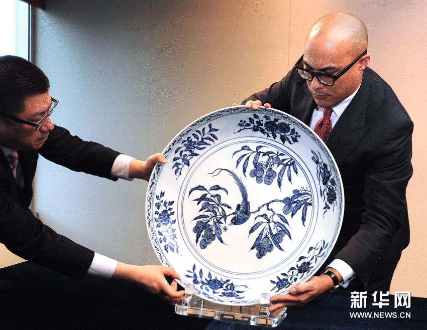 (1)3月5日,苏富比拍卖行工作人员在展示明朝永乐年制造的青花“荔枝绶鸟”图大盘,估价5000万至8000万港元。
