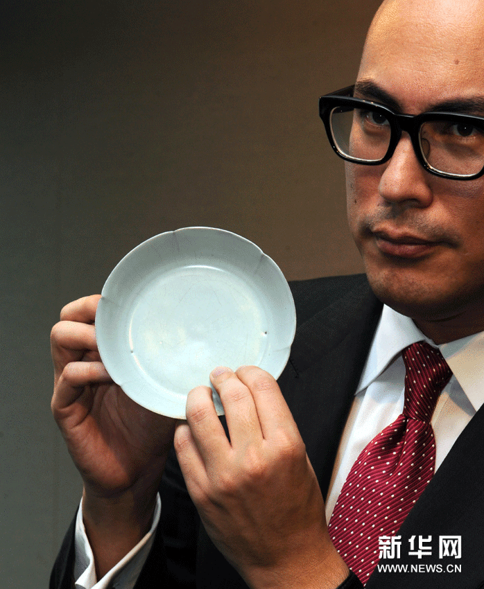 (2)3月5日,苏富比拍卖行工作人员在展示北宋汝窑制造的天青釉葵花洗,估价6000万至8000万港元。