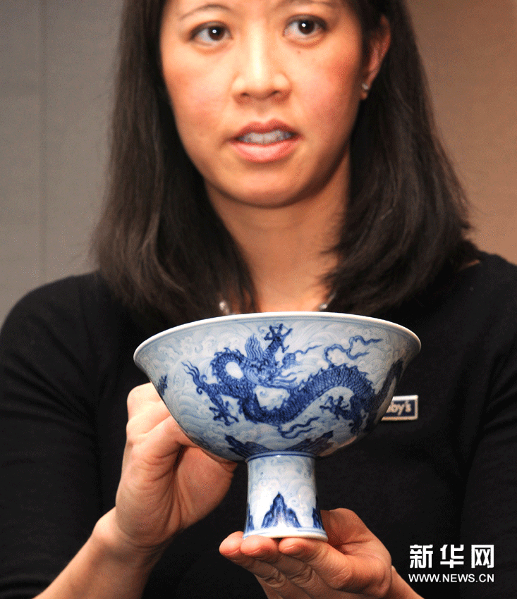 (3)3月5日,苏富比拍卖行工作人员在展示明朝宣德年制造的青花暗花“海水云龙”图高足碗,估价5000万至8000万港元。