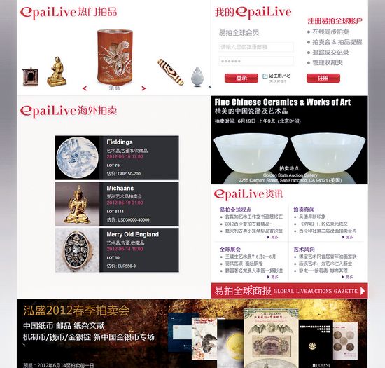 如果说hihey的拍品主要直接征集自藏家和画廊,另一个知名在线拍卖网站——易拍全球则在拍卖行和藏家之间搭建了一个在线交易的平台。这个号称全球最大的古董、艺术品网上竞拍网站可被看作是一个信息、科技、服务平台,旨在帮助全世界的拍卖行与收藏家实现跨国、跨地域的网上检索、搜索及浏览,为买家收藏古董及艺术品提供全方位的资讯服务及科技支持。易拍全球自2011年4月正式上线以来,以无一秒延迟的网络直播、线上竞拍科技,协助买家在世界各地实现网上交易。2011年10月至2012年3月,易拍全球网上竞拍成交达35笔,最高成交额达38万元人民币,实现海外代拍106笔,海外代拍成交总计折合530万元人民币。