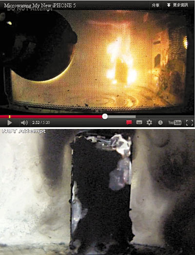 2012年9月,美国一名男子把最新推出的iPhone 5在微波炉中加热,更把过程拍摄下来,上载至视频分享网站YouTube,3天内已有逾6.7万点击率。“遭灾”的iPhone 5虽出现裂痕,着火燃烧,但离奇地没有爆炸解体。这名男子还将手机残骸放上网拍卖,起拍底价为3001美元。据网上流传的视频片段所见,男子先展示了一台全新未拆封的白色iPhone 5,再将其放进微波炉。微波炉运作后不久,手机便传出爆裂声,40秒后更起火燃烧,变成一个火球。3分钟后,男子打开微波炉将火扑熄,手机机身已被烧至焦黑,外观却仍然完整。