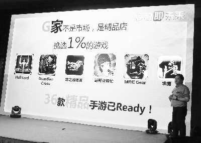 盛大游戏总裁钱东海在发布会上介绍盛大游戏“G家”手游精品店战略