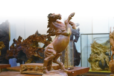 嘉善国际木雕城内展出的木雕作品——腾飞的战马