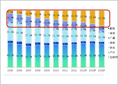 2005年至2015年中国广告市场结构(数据来源 易观智库)