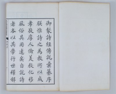 《钦定诗经传说汇纂》,二十一卷 ,首二卷,《诗序》二卷,(清)王鸿绪等撰,清雍正五年(1727年)内府刻本。半页8行,经文大字行18字,“集传”中字低一格21字,“集说”等小字双行行21字。白口,四周双边,单鱼尾。版框22.3cm×16.1cm。卷前有戴临书雍正五年《御制序》,王鸿绪、揆叙等30位纂修官职名及目录。