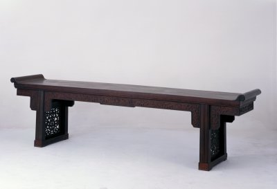 此案体量巨大,光素的案面之下承以满雕纹饰的牙条、牙头,侧面挡板亦是不惜雕工,大案用料丰厚而无单调枯燥之感,正在于采用了简繁对比的装饰手法。