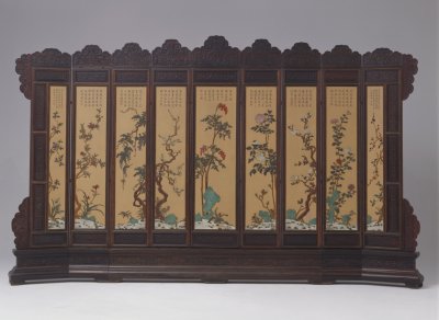 此屏为九联活页八字式。光素紫檀木边框,嵌凿绳纹铜钱。屏心米黄色地,分联镶嵌各色玉石花卉,每联首均刻乾隆题诗。屏每联上下端饰紫檀木雕开光勾莲花纹,并各附紫檀木雕如意纹边开光勾莲毗卢帽,下设紫檀雕开光勾莲沿板三联木座,黑漆描金云蝠纹屏背。