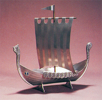 这件锡合金帆船模型,根据古代北欧维京人(Viking)的木制帆船原貌制作。船身宽大扁平,首尾尖细,向上翘起,两侧船舷各饰一排九个圆形盾牌。船舱中心竖立着一根高高的桅杆,单桅帆较大。维京人早在五至九世纪就从事航海术和造船术,并凭借这种首尾高峻的木帆船,不仅占领了北大西洋上包括英伦三岛在内的大小岛屿,而且在1000年以前就曾横渡大西洋,发现了格陵兰岛和北美大陆。古代维京人勇敢探险的进取精神和卓越的造船艺术,已成为挪威人的骄傲,奥斯陆航海博物馆收藏有维京船。这件维京船模型,底部焊有托架,上錾挪威文“SJQMANSFORBUND.NORSK”字样。