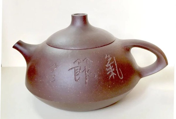 女性制壶往往关注花器,纵然光器入手也会糅入些许自身的气质。我的另一把名为《艺瓢壶》的紫泥大器,如若不知作者是李碧芳大师,只从器型气度和手法洒脱上很难看出女性心态。此壶创作于1988年,设计者是陶瓷界泰斗张守智先生,壶上书画皆为“新金陵画派”领军者、原江苏美术家协会主席亚明先生所作,一把紫砂壶能集合三位大师之力实属不易,想不看重都难。从艺术角度审视,这把壶的造型有点儿古怪,说有石瓢虚影又完全显示不出,更多是各种创新元素在对传统进行大力改造,借旧型造新器,创新中不失弘扬本意。首先是如气膨胀的碟式壶身,因环线形设计而产生出的旋动感,看似厚重感觉却轻,似乎放手就能漂浮起来,令我总想一试究竟。有次,与张守智先生论壶,说到他设计的这把《艺瓢壶》时,由于相熟话说也直,我的评价很简单:好看不好用。问题出在壶盖上的圆柱形提钮,由于腰身上端弧度渐小,盖面阔大吸力大,沾水后不易指捏手提,使用起来略感不适。仅此一句挑剔,却让他闻声大笑,然后毫不在意地回了一句:“我不会喝茶,也不懂紫砂壶,觉得怎么好看就怎么设计了。”这话让我心跳莫名,那么,早年他与汪寅仙合作并被中南海紫光阁收藏的《曲壶》也是源自这种设计理念吗?都说张守智是以当代陶瓷艺术家之心介入传统紫砂的大成者,才能无传承而入道,无羁绊而彰显自我。我曾撰文详细介绍过他与汪寅仙一“曲”成壶的创作过程,圈内圈外都没有想到,《曲壶》的设计灵感来自一个完全意外的奇想,他设计的壶让人意外让人喜欢也让人颇费琢磨。那么我的这把《艺瓢壶》是否也是一念成壶,否则为什么总能让人多些壶内猜想壶外明悟,比如做壶做什么,品壶品什么……