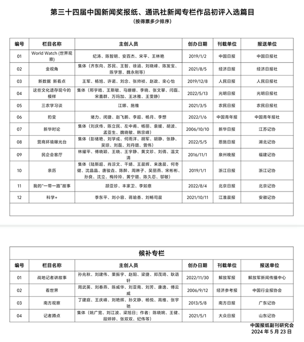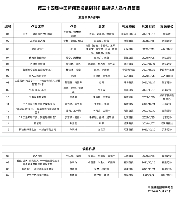 第三十四届中国新闻奖初评有关报纸副刊作品和新闻专栏作品补充公示