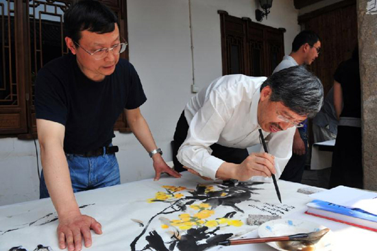 在叶店村文化礼堂,来自浙江画院的孙永等8位书画名家与金华市文联的书画家们一起对叶店村书画爱好者进行了辅导。从构图到笔法,从水法到墨法,都进行了详细讲解和示范。书画家们挥毫泼墨,现场创作了10多幅书画作品。