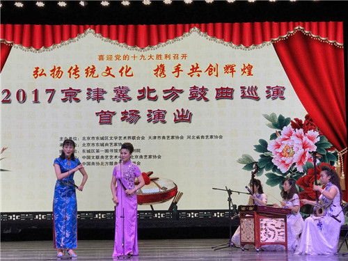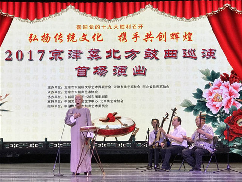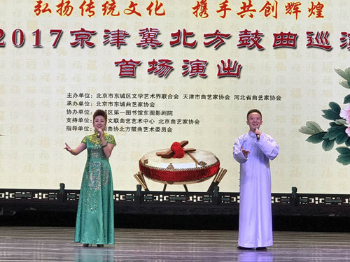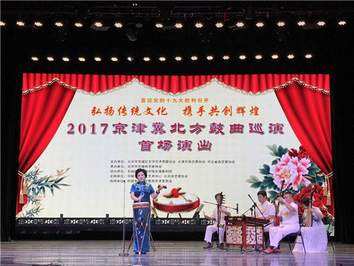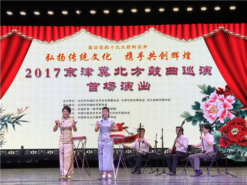 为了迎接党的十九大胜利召开,深入落实《京津冀协同发展规划纲要》,弘扬京津冀三地传统曲艺文化,由北京市东城区文联、天津市曲艺家协会、河北省曲艺家协会主办的“弘扬传统文化 携手共创辉煌”——2017年京津冀北方鼓曲巡演首场演出于9月22日下午在北京市东图影剧院启幕。
