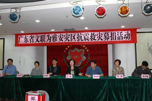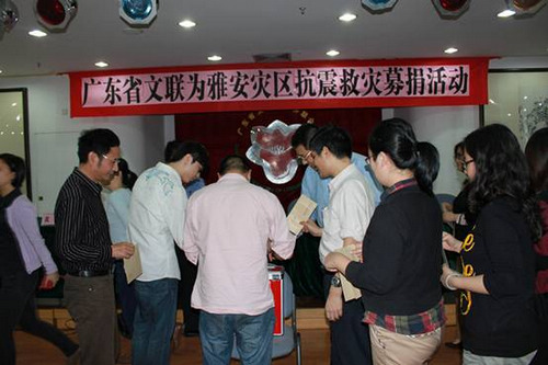 当前,省文联正在积极筹备27日组织广东文艺界进行赈灾义演募捐活动,广东戏剧界28日将组织戏剧名家进行义演募捐。省摄影家协会在雅安地震当天就在协会活动中向灾区捐款六千多元;连日来,许多艺术家、音乐人也在积极组织开展创作活动,如连向先、高翔等词曲作者连夜创作了《我们和你在一起》、《我们一起扛》、《爱心飞翔》等歌曲,为灾区人民鼓劲。