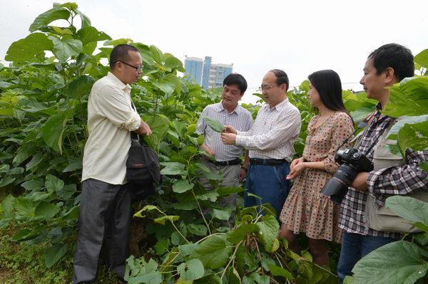 4月17日,广西文联副主席、广西摄影家协会主席施兴良率广西摄影家到自治区蚕业技术推广总站进行调研采风活动。图为参观桑园基地。
