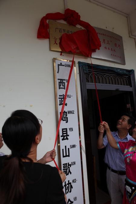 当天,广西民间文艺家协会文艺志愿服务基地在南宁市武鸣县也同时落户。武鸣县委常委、宣传部长、副县长吴秀红,广西民协专职副主席兼秘书长覃悦坤发表讲话并共同揭幕。盛装的群众还进行了山歌演唱,精彩纷呈。广西民协副主席覃祥周、黄赠荣,武鸣县文联主席卢大任参加挂牌仪式。参加人员还就民间文艺志愿服务活动的开展进行了座谈。